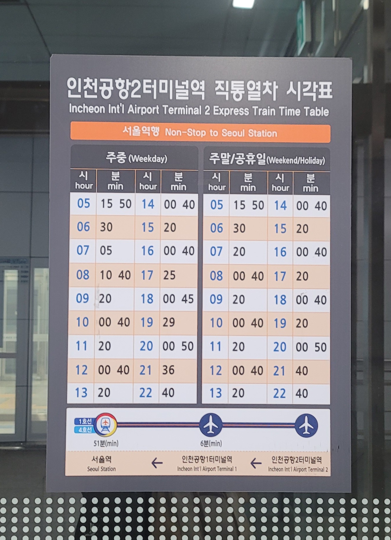 인천공항 2터미널역에서 서울역가는 직통열차 시각표