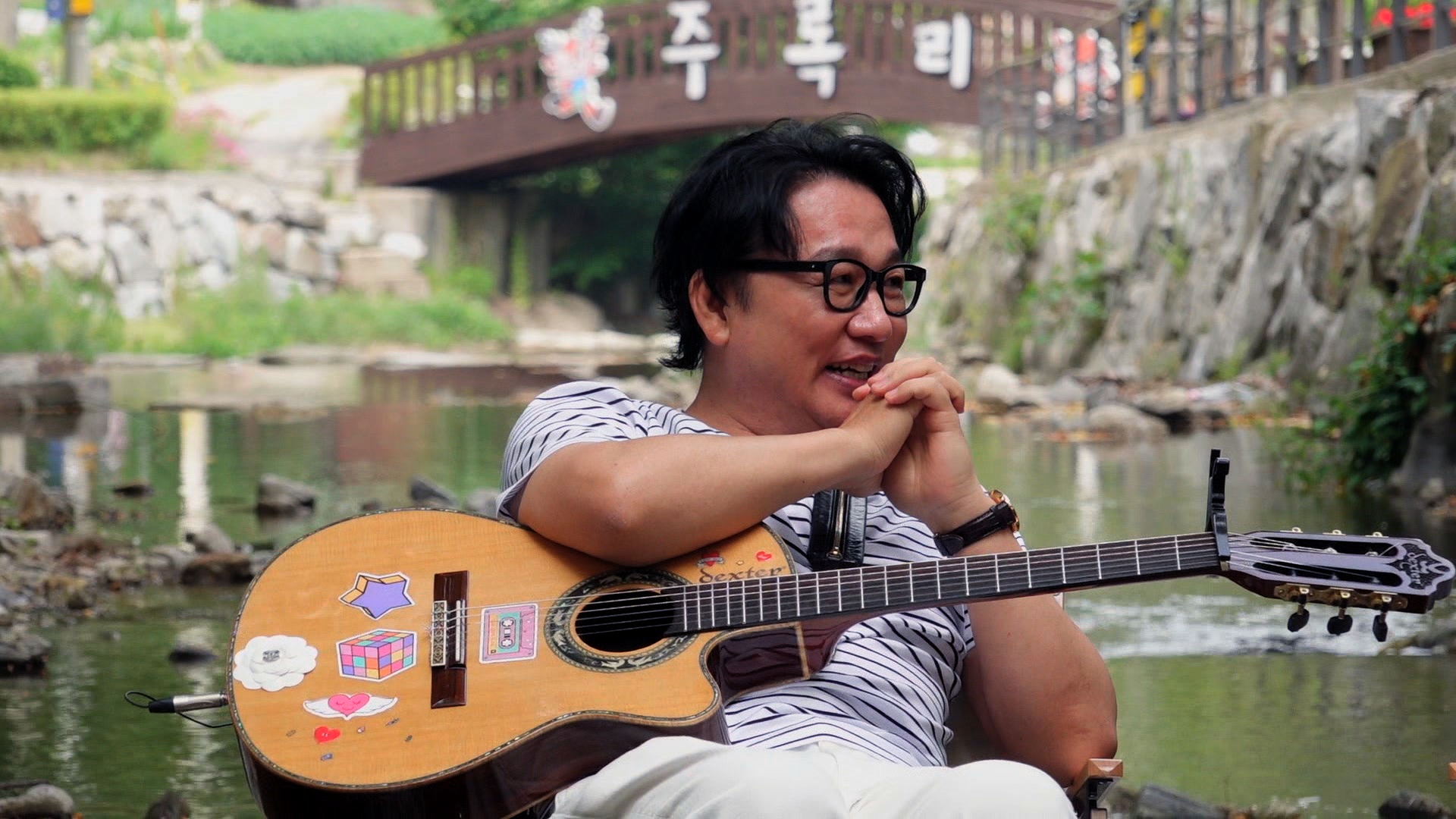 박원숙의 같이삽시다에서 위 사진에서 주록리라는 다리의 이름이 보이네요. 주록계곡에서 기타를 치는 최성수의 모습입니다.