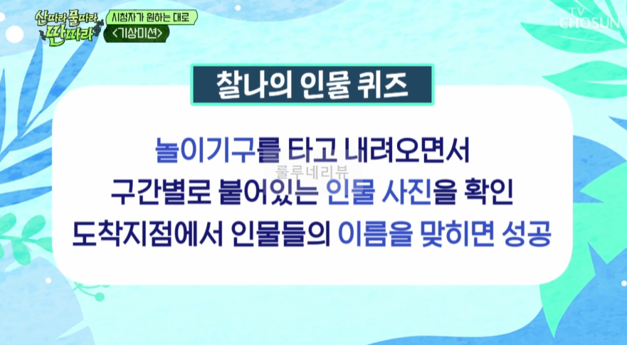 놀이기구를 타고 내려오면서 구간별로 붙어있는 인물사진을 확인, 도착지점에서 인물들의 이름을 맞히면 성공