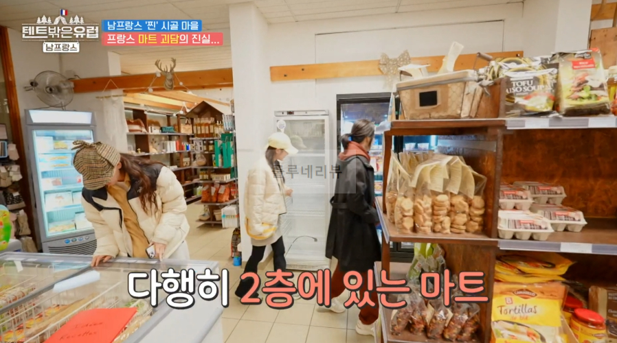 2024년 3월 10일 tvN 예능 궁상과 낭만 사이 그 어디쯤 <텐트 밖은 유럽 프랑스 편>에서는 배우 라미란과 한가인, 조보아, 류혜영은 남프랑스로 캠핑을 떠났어요. 남프랑스 로망 동화 마을 시골민박집(지트 Gite de france)에서 머물며 현지인과 함께 생활해보기로 합니다. 찐 시골마을에 있는 지트 민박집에서 체크인을 마치고 장을 보러 인근 마을로 갔어요.