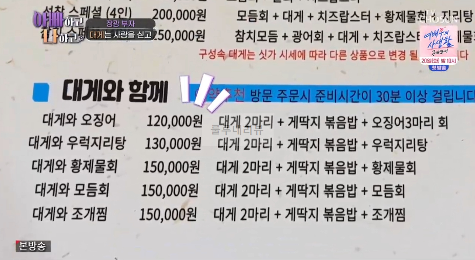 2024년 8월 14일 수요일 밤 10시 <아빠하고 나하고 아빠나> 방송에서는 장광 부자 편이 방영되며, 장광과 아내는 아들 장영이 일일 알바하는 극한의 수산업 알바하는 수산시장 회센터를 찾아갑니다. 장광과 아내, 장영이 함께 대게 세트를 먹은 곳을 찾아보았어요.