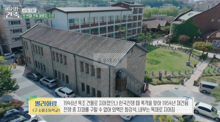 시간을 초월한 첫 번째 건축 여행지, 수원, 1946년 목조 건물로 지어졌으나 한국전쟁 때 폭격을 맞아 1954년 재건됨, 전쟁 중 자재를 구할 수 없어 외벽은 화강석, 내부는 목재로 지어짐