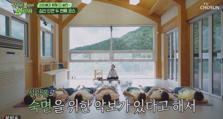 계룡 치유의 숲에서 심신 단련 첫 번째 코스 티 타임, 심신 단련 두 번째 코스는 싱잉볼과 함께 딥 슬립 체험을 합니다.
