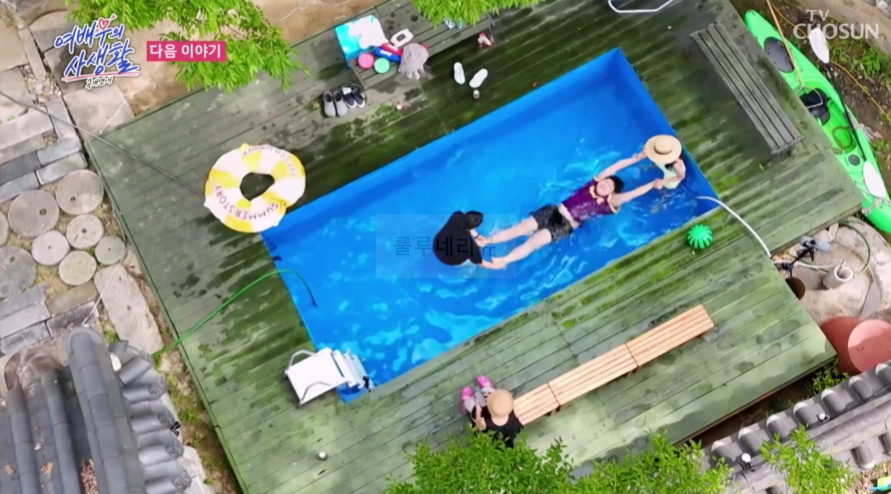 한옥 수영장에서 물놀이를 합니다.