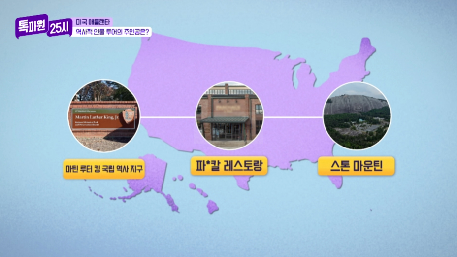2024년 10월 7일 월요일 밤 8시 50분 <톡파원 25시> 방송에서는 미국 애틀란타 톡파원 엄주영의 미국 애틀란타 인물 투어 편이 방영되며, 여행 장소를 정리해보았어요.