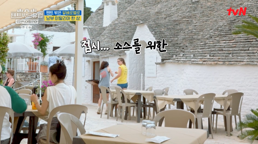 2024년 10월 31일 목요일 저녁 8시 40분 라미란, 곽선영, 이주빈, 이세영의 <텐트 밖은 유럽 로맨틱 이탈리아> 방송에서는 텐트 밖은 이탈리아 편이 방영되며, 현실판 스머프 마을 알베로벨로에서 유네스코 문화유산으로 등록된 전통가옥 트롤리 숙소에서 머물기로 합니다. 그리고 3,000년된 고대 도시 마테라가 소개되었어요. 250년된 트롤리 숙소 체크인을 마치고 동네 산책을 하다가 남부 이탈리아 한 상으로 파스타 등을 주문했어요.
