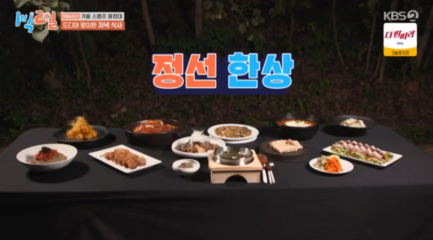2024년 11월 3일 일요일 저녁 6시 10분 김종민, 문세윤, 딘딘, 유선호, 이준, 조세호 예능 일박이일 1박 2일 시즌4 방송에서는 가을이다 사랑해, 가을 맛보러 왔어요 '가을 스탬프 원정대' 편이 방영되며, 강원특별자치도 영월군과 정선군으로 여행을 떠났어요. 1박2일 역대급 초호화 베이스캠프에서 저녁 식사를 먹는 모습이 공개되었어요. 강원도 정선에서 나는 식재료로 만든 건강한 정선 한 상, 정말 먹음직스럽네요.