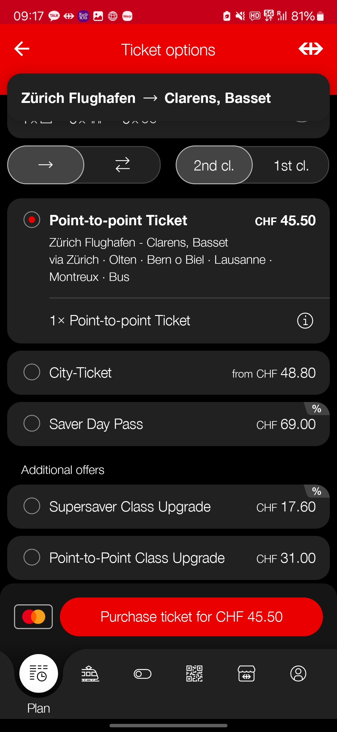 위 그림은 point-to-point 티켓으로 Clarens에서 Zürich Flughafen(취리히 공항)까지 가는 티켓으로 정거장 이름과 출발 시간이 정해져있어요. 이 시간의 것만 탑승할 수 있답니다.