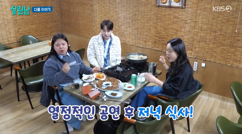 이날 회식 메뉴로는 몸보신 음식으로 잘 알려진 백숙과 닭볶음탕이 준비되었습니다. 푹 끓여낸 닭고기의 깊은 맛이 느껴지는 백숙과 매콤한 양념이 어우러진 닭볶음탕은 공연을 마친 뒤 허기를 달래기에 제격인 메뉴로, 세 사람은 따뜻한 식사를 함께하며 훈훈한 시간을 보냈습니다.