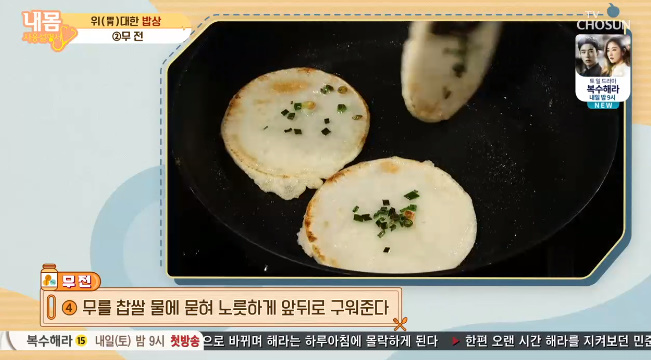 무를 찹쌀 물에 묻혀 노릇하게 앞뒤로 구워주세요.