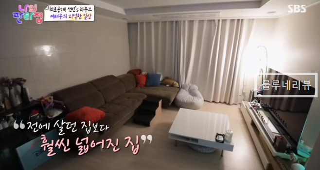 전에 살던 집보다 훨씬 넓어진 집, 하지만 집에 오면 쉬는 것 같지 않다고 합니다. 그래서 쉴 수 있는 힐링 하우스를 찾고 있는 것 같아요. 이선빈 집의 넓은 거실이예요.