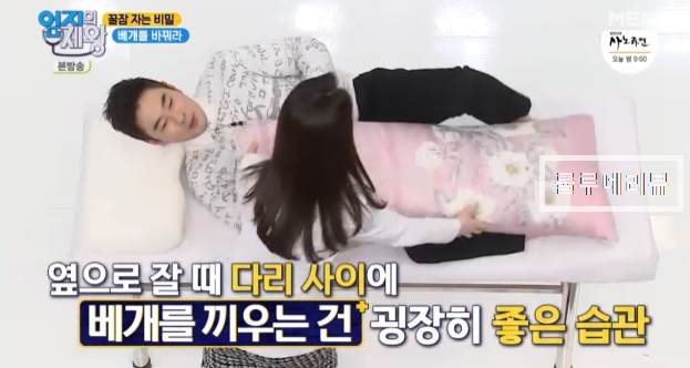 옆으로 잘 때 다리 사이에 베개를 끼우는 건 굉장히 좋은 습관이라고 합니다. 다리 사이에 베개를 끼우면 양쪽 다리 곧게 유지가 가능합니다.