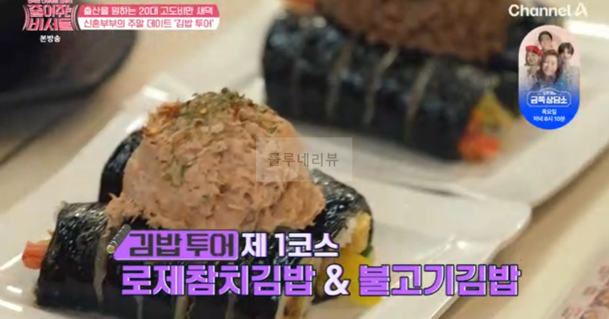 채널A 줄여주는 비서들 5회 신혼부부의 주말 데이트 '김밥 투어' 로제참치김밥, 불고기김밥, 건강김밥 3종, 불어묵김밥, 돈가스김밥, 묵은지감태김밥 - 유주