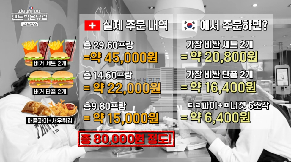 방송에서 스위스 맥도날드와 한국 맥도날드 가격을 비교해주었어요. 버거 세트 2개와 버거 단품 2개, 애플파이, 새우튀김을 먹으면 약 8만원정도입니다. 스위스 레스토랑에 비하면 맥도날드는 엄청 싼편이죠 ^^; 스위스 몽퇴르에 있는 수제버거 레스토랑에 가면 2명이서 먹으면 기본 10만원 정도라고 보시면 되요.