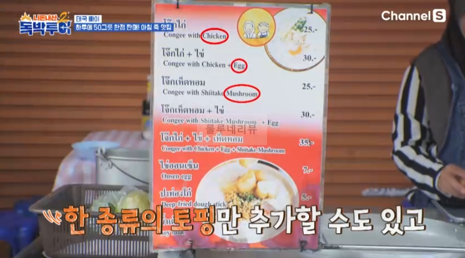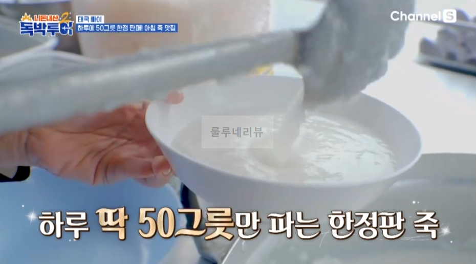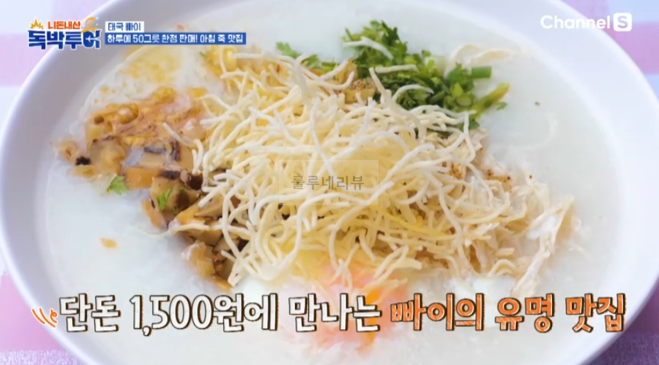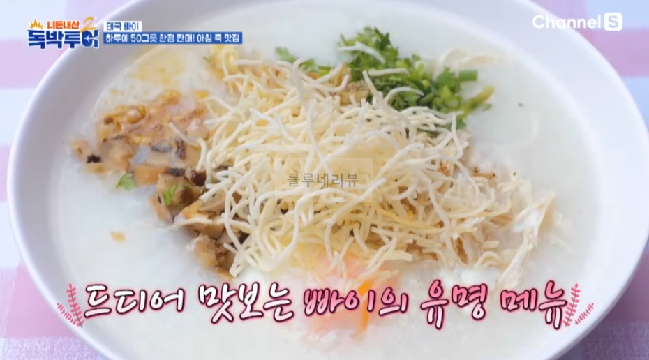 2024년 8월 10일 토요일 밤 10시 <독박투어 시즌2> 방송에서는 독박즈 김대희, 김준호, 장동민, 유세윤, 홍인규는 태국 빠이(Thailand Pai) 여행을 떠났어요. 하루에 50그릇 한정 판매, 아침 죽 맛집을 찾아보았어요. Rice Forridge라고 쓰여있는 노점 가게