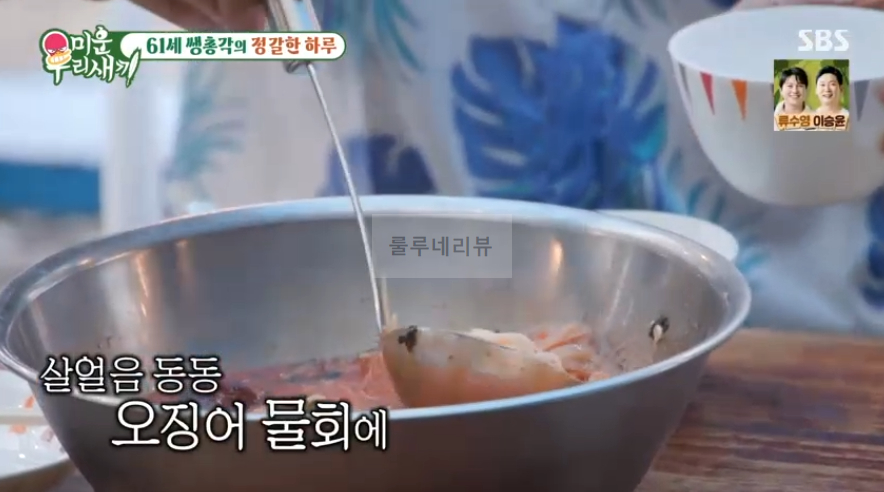 2024년 8월 11일 일요일 밤 9시 5분 미운 우리 새끼 미우새 방송에서는 61세 쌩총각의 정갈한 하루, 김일우가 이사간 강원도 강릉의 아파트에 이상민과 김승수가 찾아갑니다. 김일우와 김승수, 이상민은 하와이안 셔츠(이상민 집들이 선물)를 입고 김일우 단골 핫플레이스, 김일우 아는 동생이 하는 펜션에서 오징어 물회와 싱싱한 조개구이, 가리비구이를 먹기로 합니다.