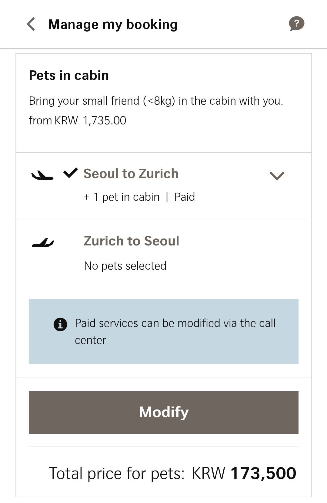 스위스 항공, 인천 - 취리히 직항은 8kg 이하 반려견을 기내 동반할 수 있는데요. 비용은 1 마리당 173,500원이예요.