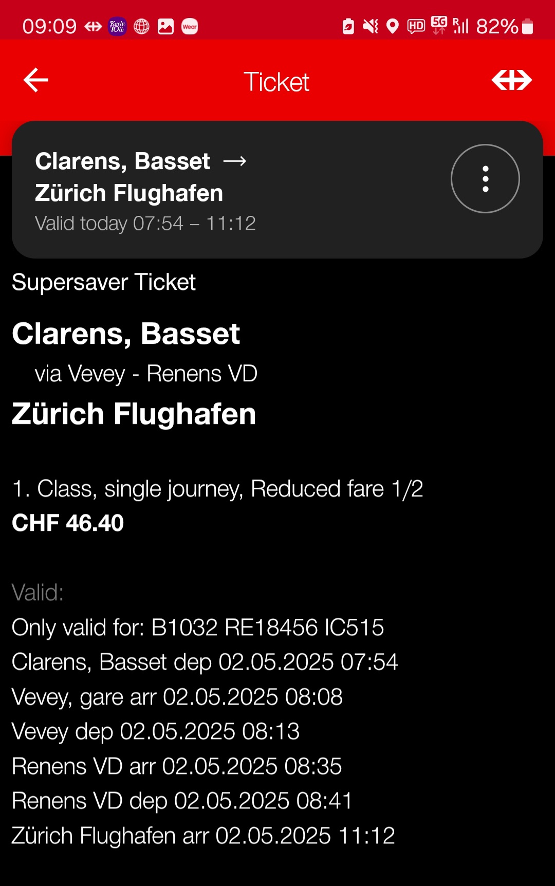 스위스 기차 앱 SBB에서 가장 저렴한 할인 티켓 중 하나인 point-to-point ticket의 경우, 정해진 시간에 정해진 버스나 기차, 트램을 탑승할 수 있어요.